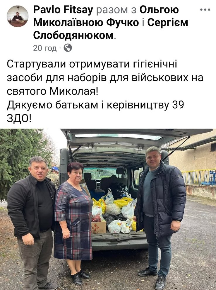 Колектив ЗДО №39 “Журавлик” під керівництвом директора Ольги Миколаївни Фучко, батьки та вихованці долучились до акції “Миколай іде в окоп” – зібрали гігієнічні набори, теплі шкарпетки, чай, каву, печиво, а малята виготовили листівки та невеличкі сувеніри для наших захисників.
