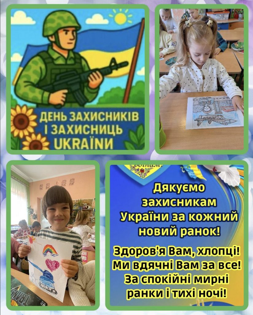 У нашому дошкільному закладі із вихованцями середніх та старших груп проведено тематичні заняття, на яких діти дізналися про героїчне минуле козацтва та сучасних воїнів-захисників, що мужньо боронять кордони та цілісність нашої держави. Протягом дня діти малювали малюнки, які через волонтерів були передані захисникам, які лікуються після поранень. Також спільними зусиллями директора ЗДО Ольги Миколаївни Фучко, колективу, батьків була зібрана благодійна допомога на потреби наших воїнів, яка відправляється в гарячі точки нашої країни. Наближаємо нашу ПЕРЕМОГУ разом!